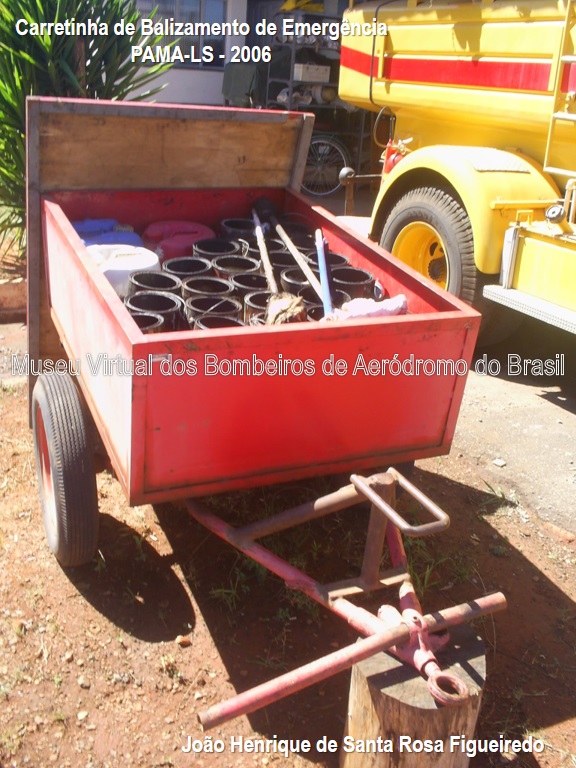 Carretinha adaptada pelos bombeiros do PAMA-LS para transportar as latas do Kit de Balizamento de Emergência , fotografada em 2006.